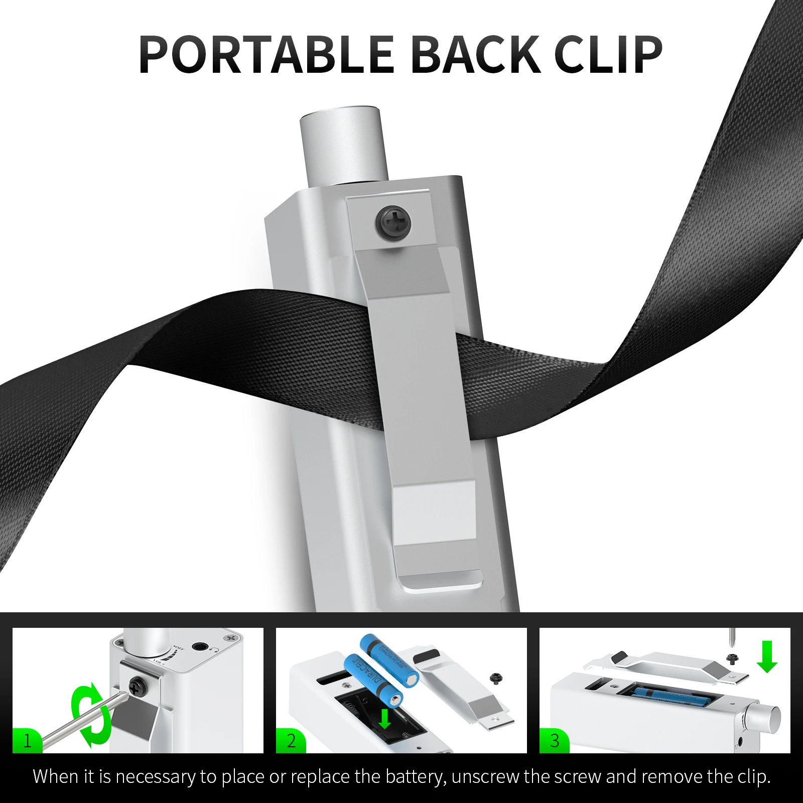 8.Cuando sea necesario colocar o reemplazar la batería, desenrosque el tornillo y retire el clip.