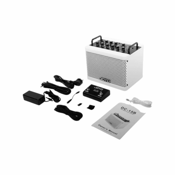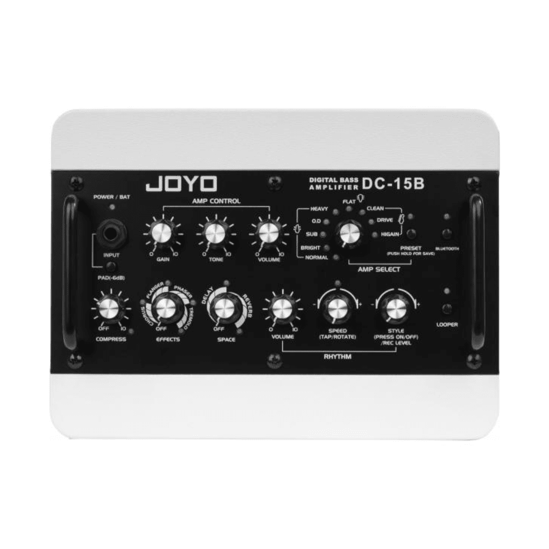Amplificador – Palante digital portátil para bajo eléctrico con potencia de 15W, ideal para practicar, componer o tocar al aire libre. El modelo JOYO DC-15B ofrece una experiencia versátil gracias a sus efectos incorporados, conectividad Bluetooth, looper de 30 segundos y caja de ritmos con 36 patrones. Soporta grabación directa vía USB-C y 3,5 mm.