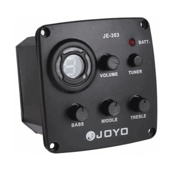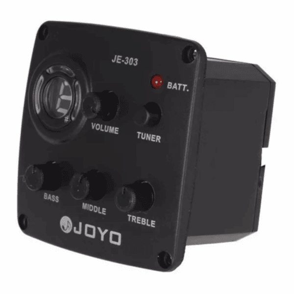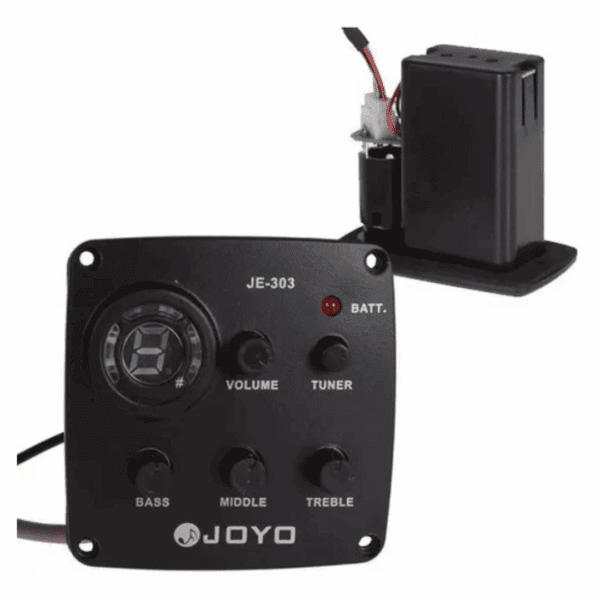 El Joyo JE-303 es un sistema de cápsula con ecualizador de 3 bandas y afinador digital integrado, diseñado especialmente para guitarras acústicas. Su tamaño compacto y su instalación directa lo convierten en una solución eficaz para mejorar el control tonal del instrumento en vivo o en estudio.