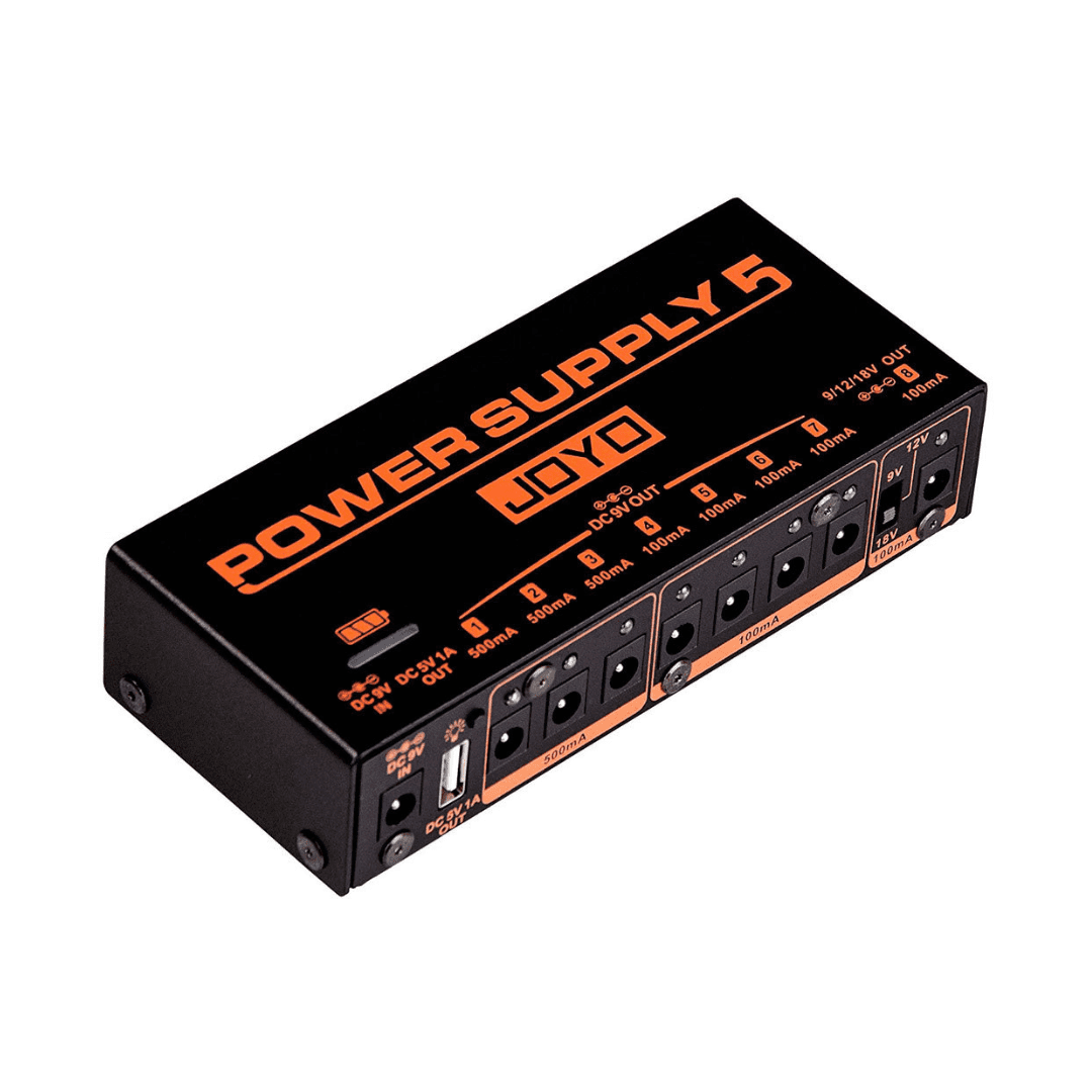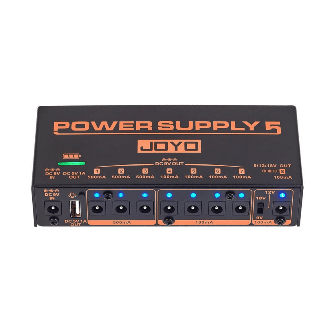 La Joyo Power Supply 5 JP-05 es una fuente de alimentación profesional recargable, diseñada para guitarristas que requieren portabilidad, eficiencia y bajo ruido. Su batería de litio integrada permite alimentar múltiples pedales sin necesidad de estar conectada a la red eléctrica, eliminando interferencias y maximizando la limpieza del sonido.