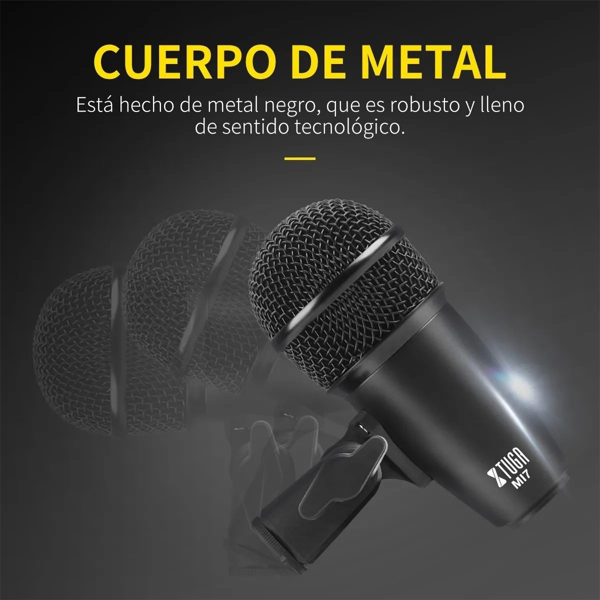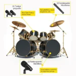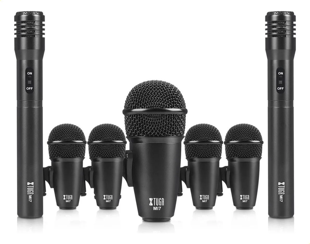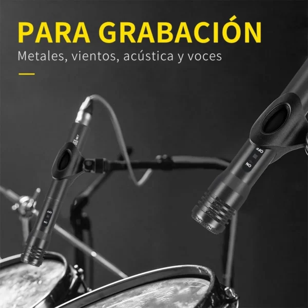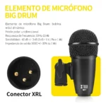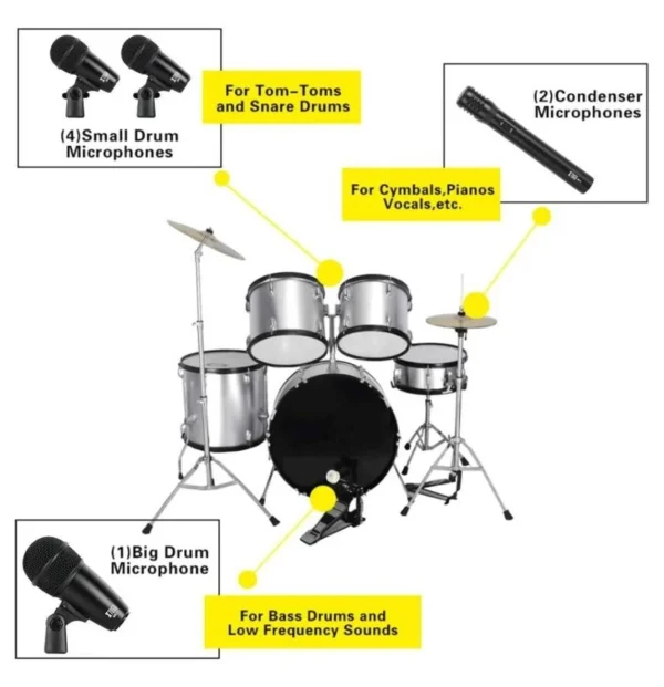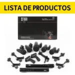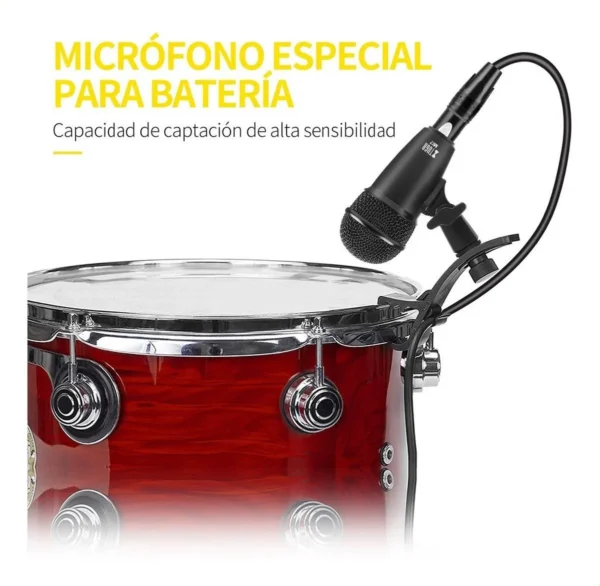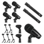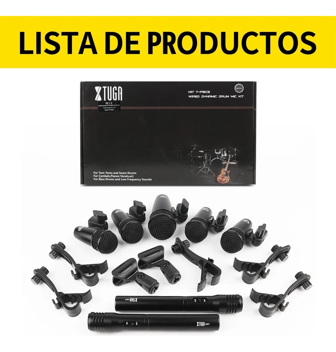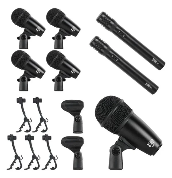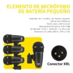 4 micrófonos de batería Tom-Tom, 1 micrófono de bombo, 2 micrófonos para platillos, 5 clips de batería, 2 clips tipo U, 1 caja de color, 1 manual de usuario