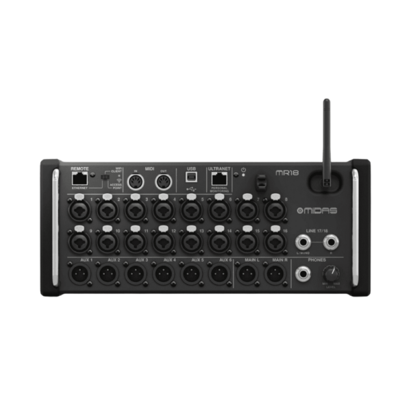 El Midas MR18 es un mezclador digital compacto de 18 canales, diseñado para aplicaciones profesionales en estudio y escenarios. Ofrece conectividad XLR/TRS, salidas estéreo y control remoto inalámbrico vía tablet o PC. Su construcción robusta lo hace perfecto para instalaciones en rack y su flexibilidad lo convierte en una solución confiable para bares, clubes, discotecas y transmisiones en vivo. Con potencia estable y un flujo de trabajo intuitivo, brinda calidad de mezcla de nivel profesional.
