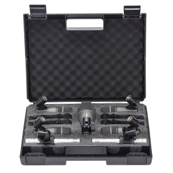 El DK707 es un paquete de micrófono de rango completo para bateristas profesionales. Incluye un micrófono de bombo Q71, cuatro micrófonos de instrumento Q72 y dos micrófonos de condensador tipo lápiz C02. Con un alto manejo de SPL, el Q71 está optimizado para capturar la esencia completa de su bombo. Con una respuesta de frecuencia especializada, los Q72 ayudan a reproducir el tono natural y el ataque de sus tambores y timbales. Por último, los C02 son perfectos para aplicaciones de micrófonos aéreos y ambientales.