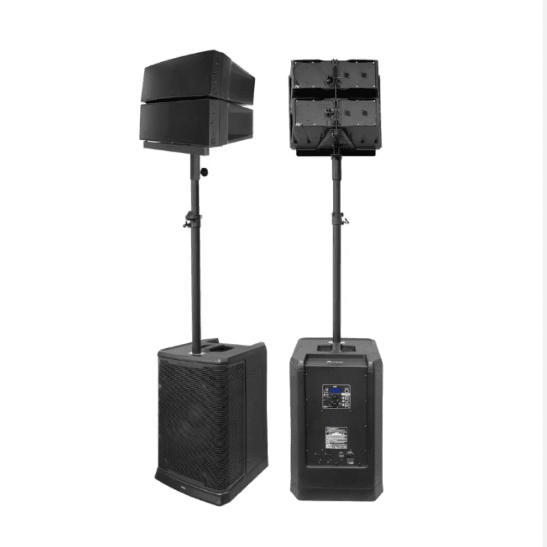 Los sistemas de sonido de columna incluidos en este pack ofrecen una dispersión más amplia y uniforme que los sistemas tradicionales, ayudando a mantener claridad vocal y presencia musical en todo el espacio. Su diseño modular permite un montaje rápido y práctico, lo que los hace ideales para eventos móviles, presentaciones en vivo o instalaciones temporales.