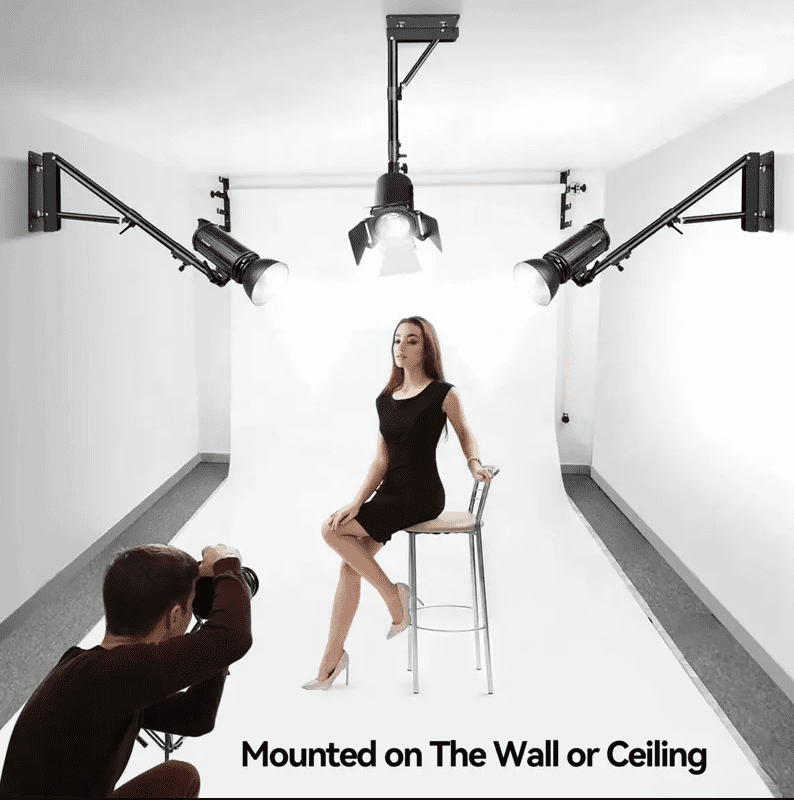 Si estás armando un set fijo (o semi fijo) y quieres ganar espacio, este brazo triangular para pared/techo te permite montar y posicionar iluminación sin ocupar trípodes en el piso. Su rango ajustable de 75 a 180 cm ayuda a ubicar la luz donde realmente sirve: arriba, hacia un costado o sobre el sujeto, con un montaje más limpio y estable.
