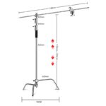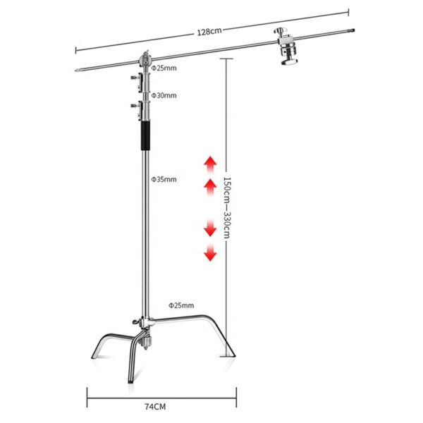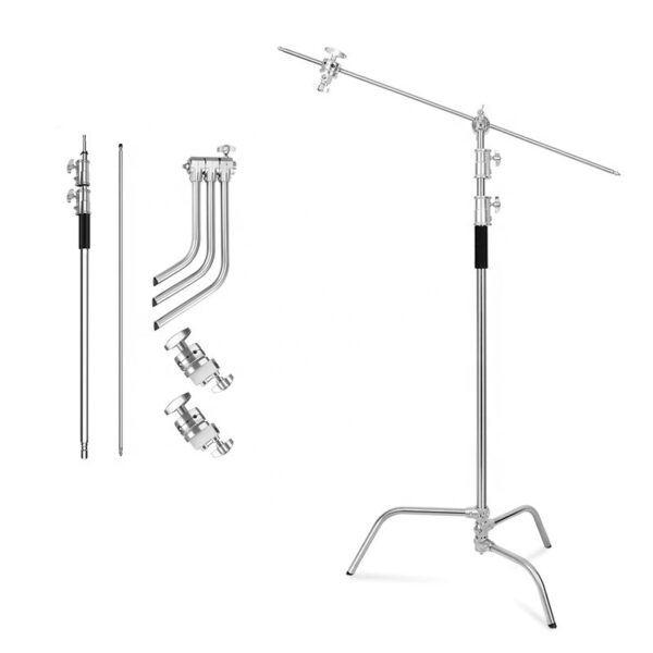 Cuando necesitas un soporte que no se inmute con luces, accesorios y ajustes finos, un C-Stand es la herramienta correcta. Este modelo de acero inoxidable alcanza hasta 3,3 m de altura y suma un brazo (cross arm) para posicionar la luz o el modificador con precisión, ideal para estudio, video y foto.