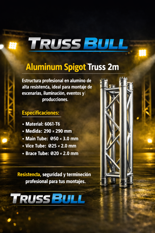 La Aluminum Spigot Truss 2m está fabricada con aluminio de primera calidad 6061-T6, diseñado para ofrecer una durabilidad y estabilidad excepcionales. Su composición robusta la convierte en una excelente opción para el montaje de escenarios, iluminación y estructuras para eventos, donde la confiabilidad es fundamental.